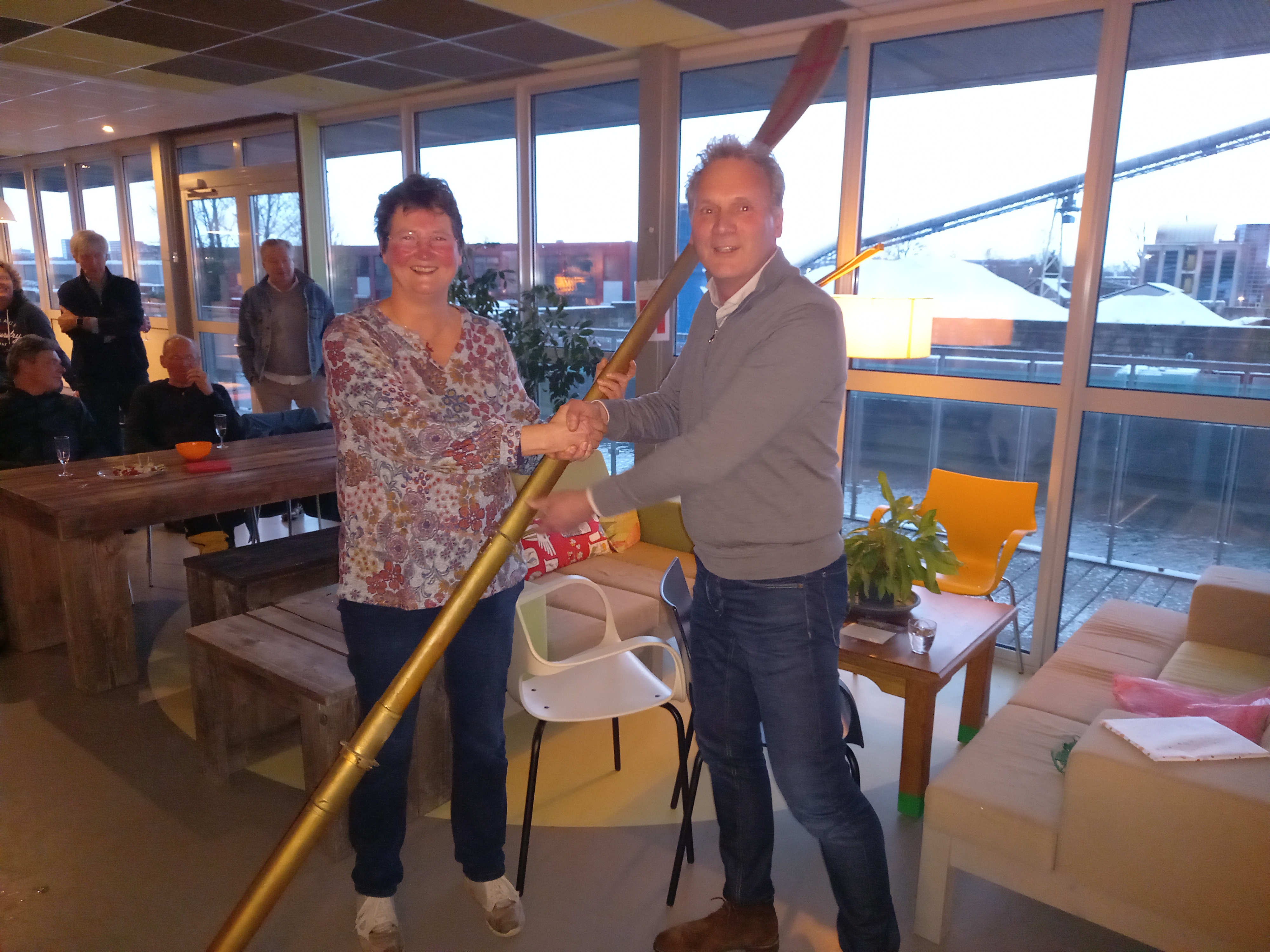 Met gepaste trots geeft John van de Coevering het stokje (of beter gezegd: de Gouden Riem), over aan niemand minder dan Paulien Hartog! Dankjewel voor al je inzet bij het marathon roeien en de Eemhead.